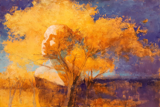 I roughly blocked in the cool blues and purples with a pallet knife and large brush. I realized early on that the color and value relationships between the tree and the face needed to develop simultaneously, so I transferred the figure.